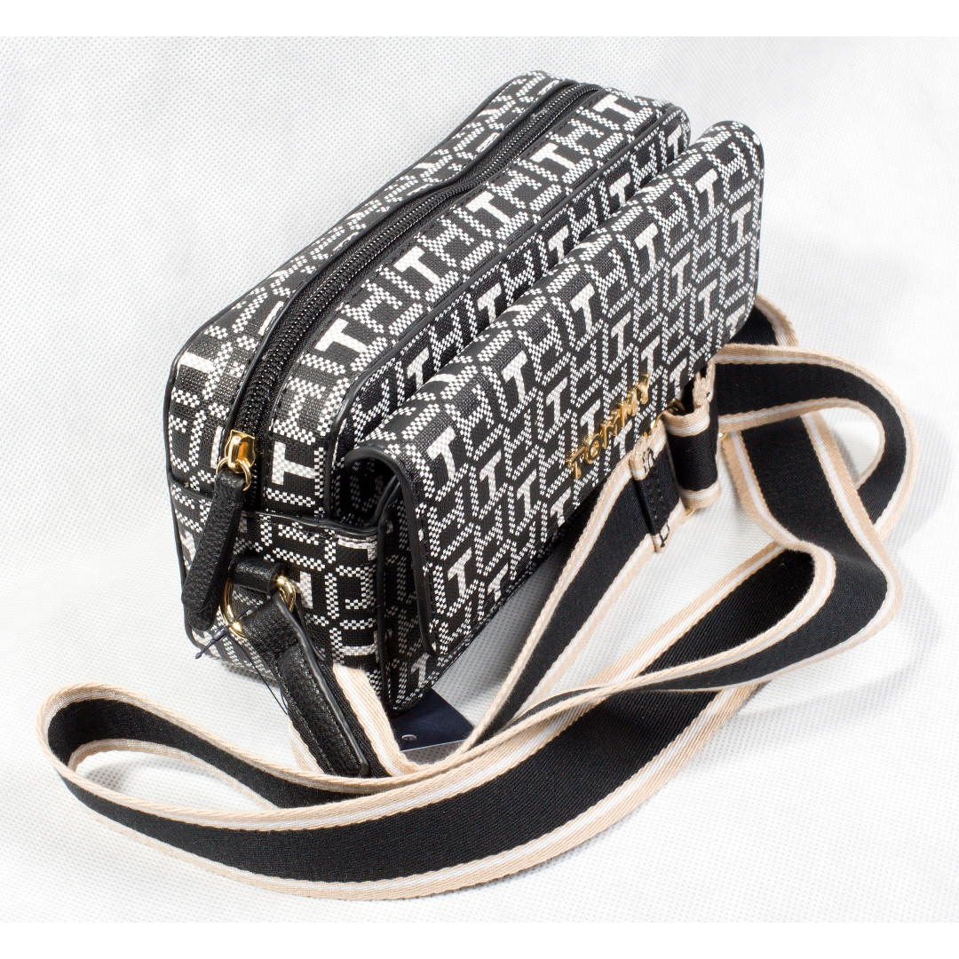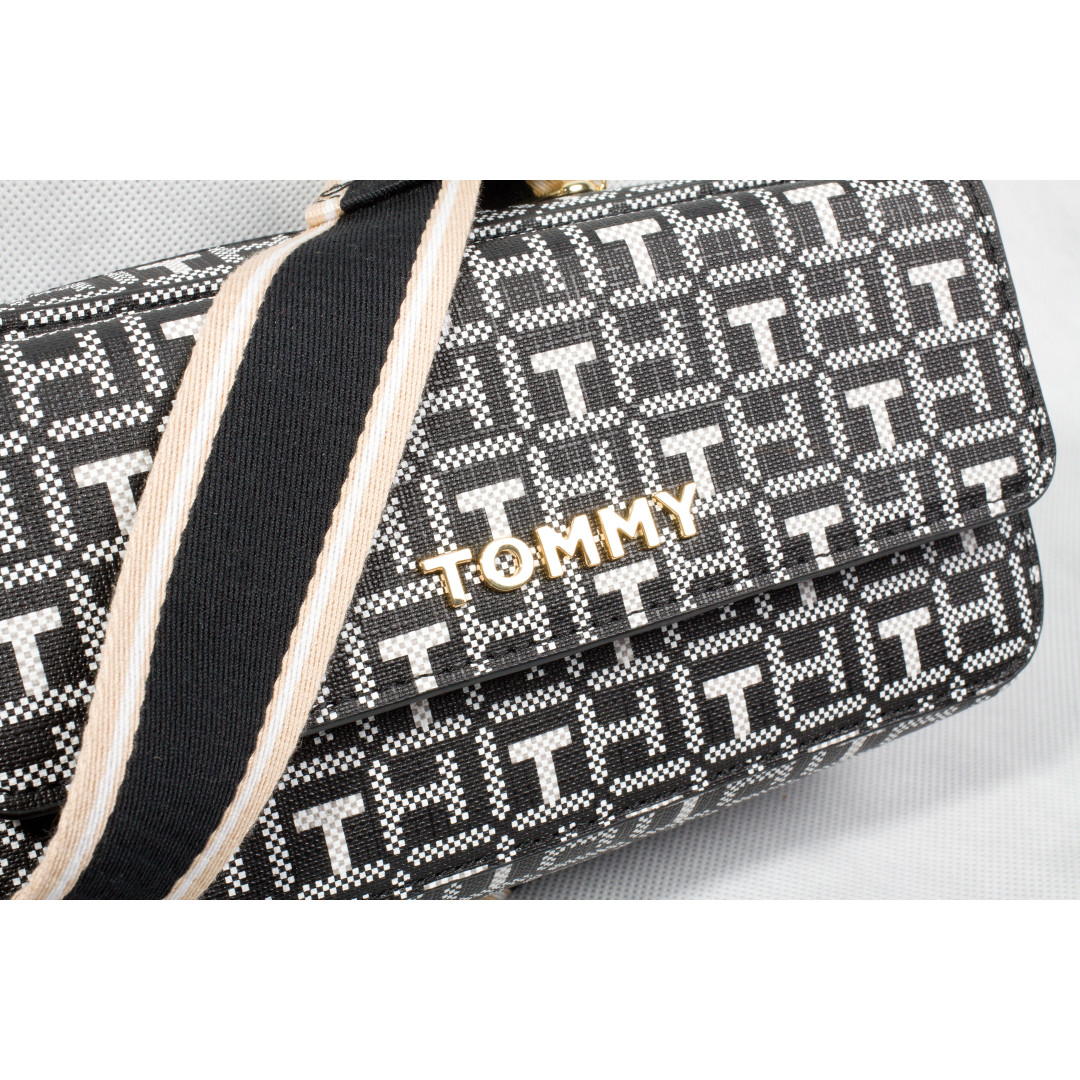 Dámská kabelka Tommy Hilfiger Typ: crossbody Materiál: textil a syntetická kůže Barva: černá s bílým vzorem Rozměry: cca 20 x 15 x 7 cm Nastavitelný ramenní popruh Zapínání na zip Hmotnost: přibližně 0,5 kg