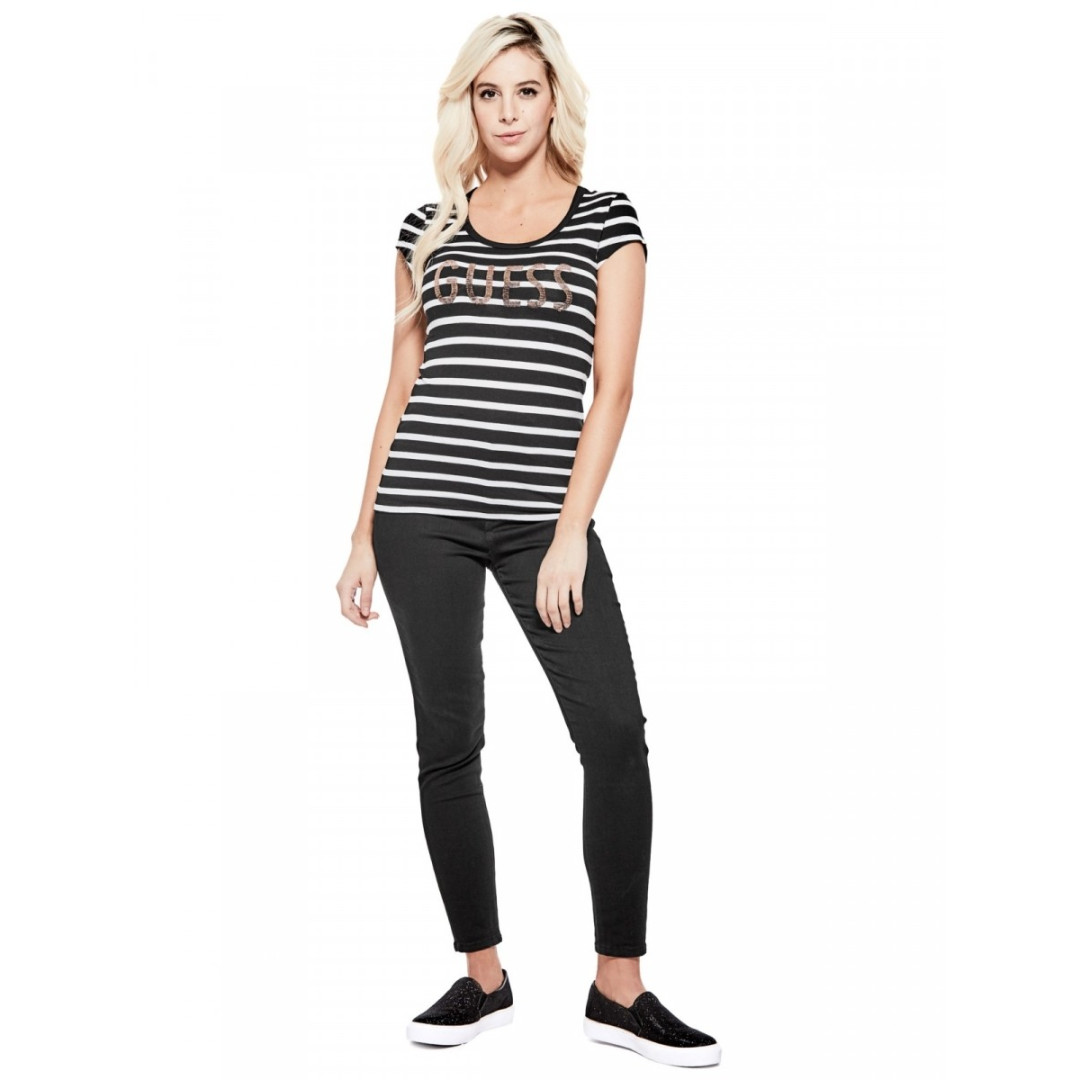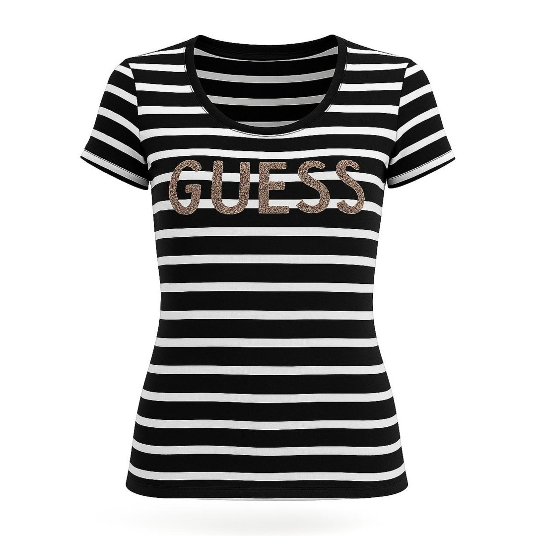GUESS tričko Kella Logo Striped Tee černé je stylový kousek, který dodá tvému outfitu šmrnc. S černým pruhovaným designem a výrazným logem GUESS na přední straně je toto tričko skvělou volbou pro každodenní nošení. Jeho pohodlný materiál a perfektní střih ti zajistí maximální pohodlí a styl. Dopřej si toto tričko a vytvoř si neodolatelný look.